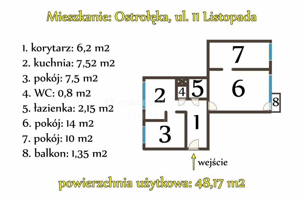 Na sprzedaż mieszkanie o powierzchni 48,17 m2, położone na 3. piętrze w bloku z wielkiej płyty z 1976 roku, zlokalizowanym przy ul. 11 Listopada w Ostrołęce. Nieruchomość oferuje funkcjonalny i dobrze przemyślany układ pomieszczeń, obejmujący trzy ustawne pokoje, osobną kuchnię, korytarz, łazienkę oraz oddzielne WC, co znacząco podnosi komfort codziennego użytkowania. Dodatkowym atutem mieszkania jest balkon, a także przynależna piwnica, zapewniająca dodatkową przestrzeń do przechowywania.Lokal jest czysty i zadbany, jednak zachowany w standardzie z lat 80., co daje nowemu właścicielowi szerokie możliwości aranżacyjne. Mieszkanie doskonale sprawdzi się zarówno jako propozycja do zamieszkania po odświeżeniu, jak i jako baza do generalnego remontu i stworzenia nowoczesnej przestrzeni według własnych potrzeb.