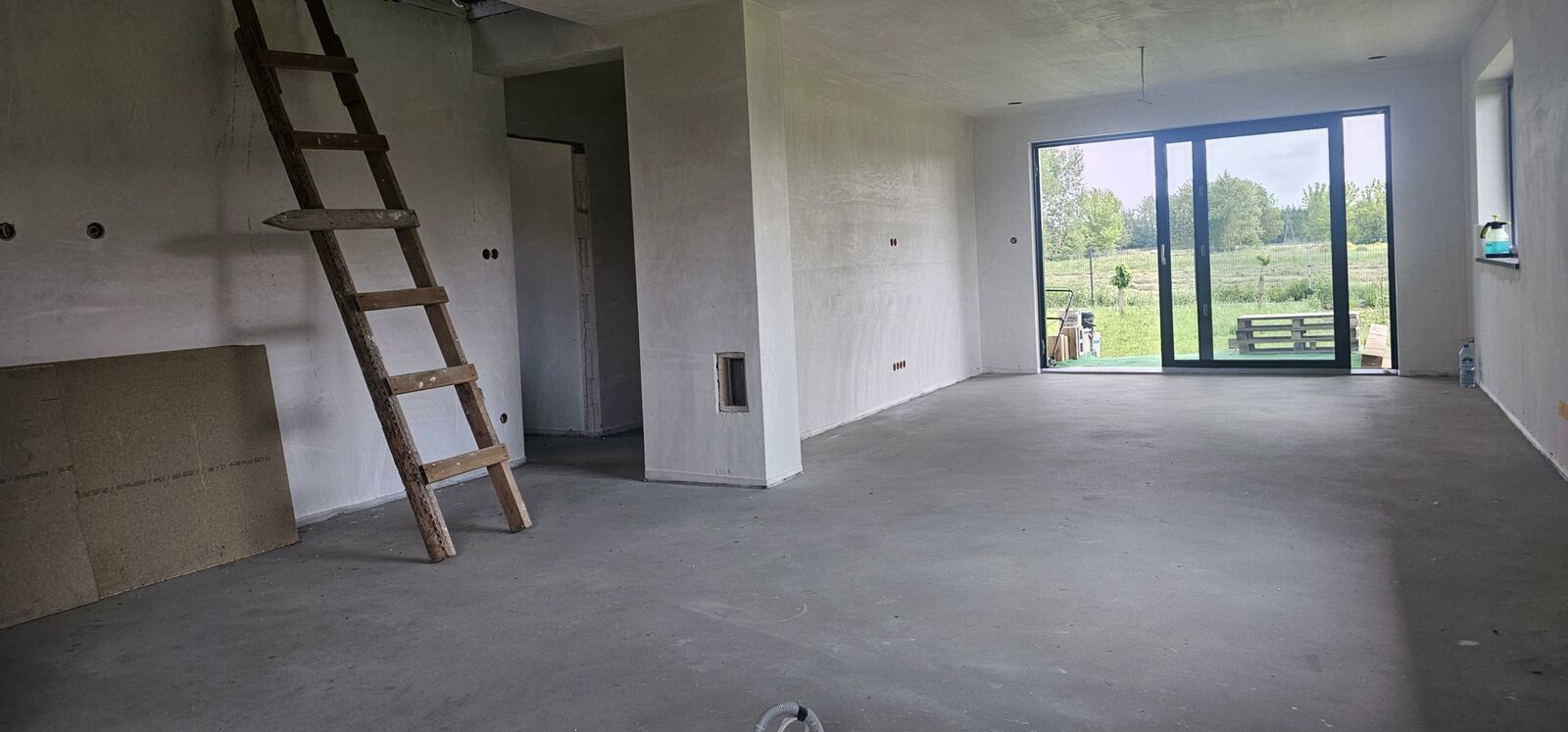 Jasny salon z miejscem na kominek i wyjściem na taras