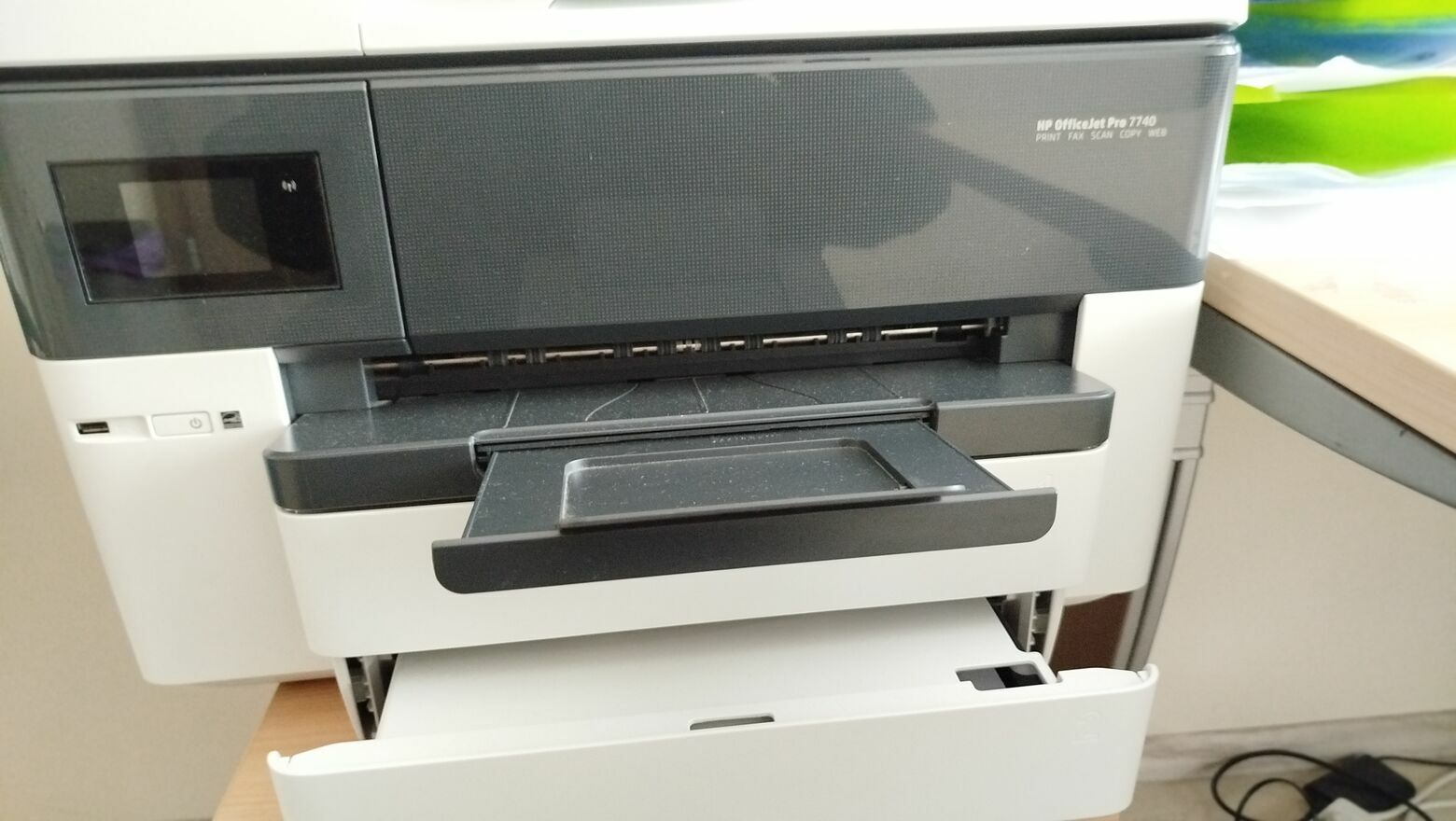 Na sprzedaż pakiet trzech drukarek atramentowych:HP OfficeJet Pro 7740 - głowica do wymiany, tusze 50% + nowe