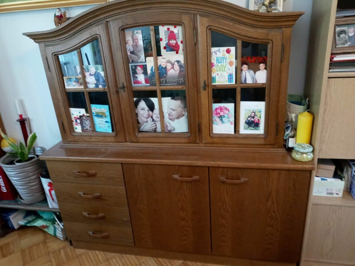 1. Kredens 2-częściowy. Bardzo praktyczny. Góra zdejmowana.Wymiary: dł. 150 cm, szer. 45 cm, wys. 156 cm. Cena 450 zł.