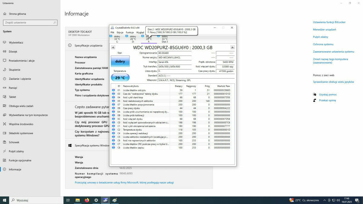 Dysk twardy: 2 TB WDC WD20PURZ-85GU6Y0