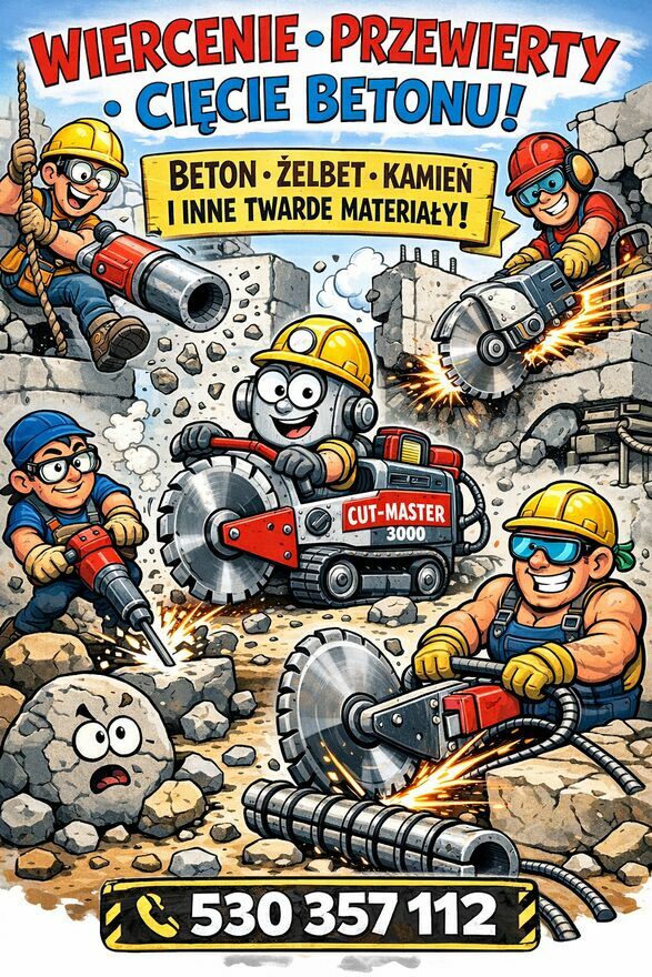 Firma PAW-MAR wykona cięcia, otwory w betonie, betonie zbrojonym, asfalcie, pustaku, kostce brukowej i innych twardych materiałach budowlanych pod każdym kątem, pionie czy poziomie do głębokości 120 centymetrów.Przewierty i cięcia do: